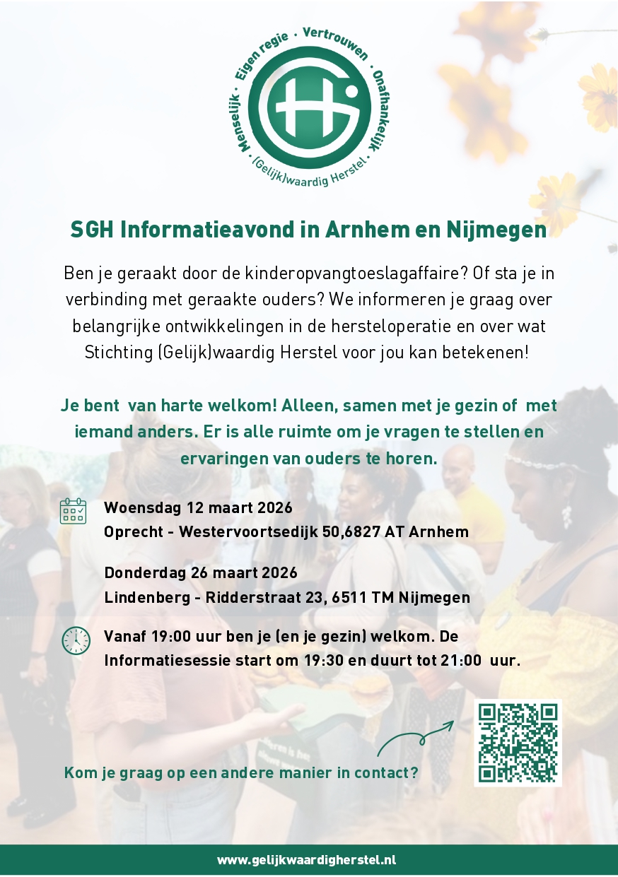Ben je geraakt door de kinderopvangtoeslagaffaire of ken je geraakte ouders dan kun je je opgeven of ouders verwijzen naar onderstaande bijeenkomsten.