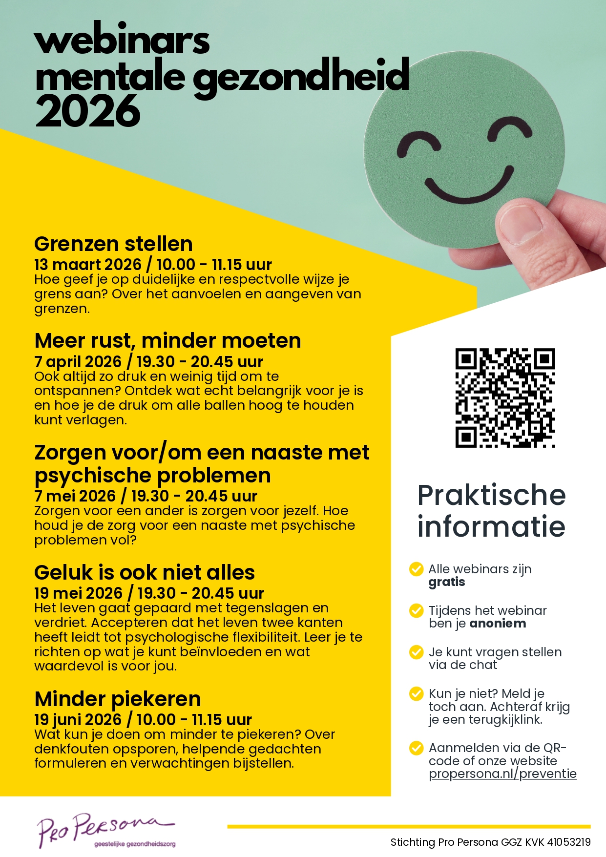 Binnenkort organiseert Pro Persona Preventie gratis webinars Mentale gezondheid over de onderstaande thema’s waarbij je je kunt opgeven via de QR code;